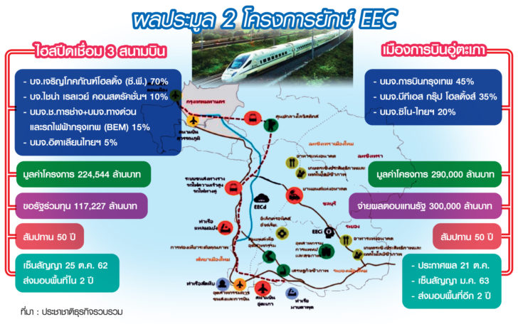 เจรจาต่อรองมาเกือบปี ในที่สุดรถไฟความเร็วสูงเชื่อม 3 สนามบิน (ดอนเมือง-สุวรรณภูมิ-อู่ตะเภา) ไฮสปีดแห่งความหวังของ “รัฐบาลประยุทธ์” กำลังจะแจ้งเกิดในพื้นที่เขตเศรษฐกิจพิเศษภาคตะวันออก (อีอีซี) โดยมี “พลเอกประยุทธ์ จันทร์โอชา” นายกรัฐมนตรี เป็นประธานเซ็นสัญญาร่วมทุนรัฐและเอกชนครั้งประวัติศาสตร์ มูลค่าถึง 224,544 ล้านบาท ถือเป็นผลงานชิ้นใหญ่